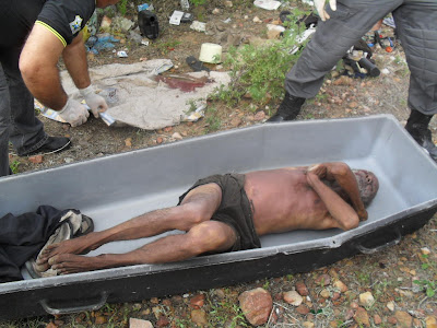A Viatura do Oficial de dia se deslocou até o Bairro Recreio, mais precisamente por trás do Hospital Psiquiátrico Dr. Milton Marinho, e confirmou que no local hávia o corpo de um homem aparentando de 50 a 60 anos de idade.